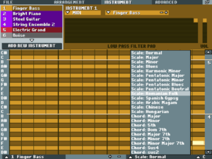 La música en formato MIDI se basa en guardar una representación númerica de las notas y su duración y el número de instrumento elegido. Es por esto que la lista de instrumentos es fija y su tipo de sonido depende del chip sintetizador de la tarjeta de sonido. En el caso de la época DOS era muy común las tarjetas Sound Blaster, con su chip Yamaha, y las Adlib.